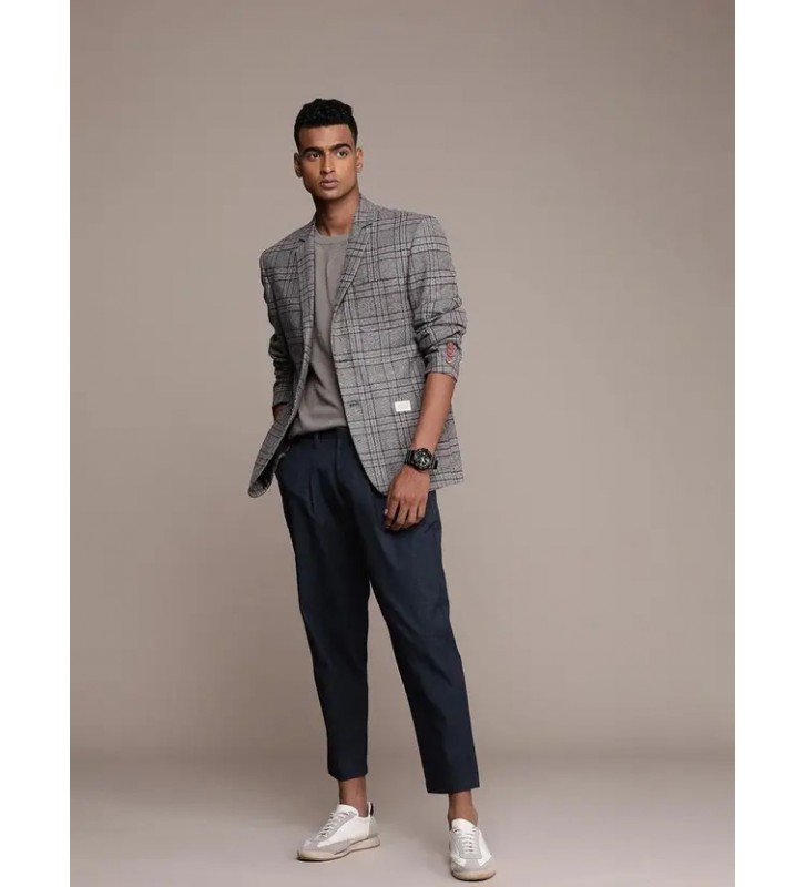 Men Checkered Single Breasted Casual Blazer (Grey)