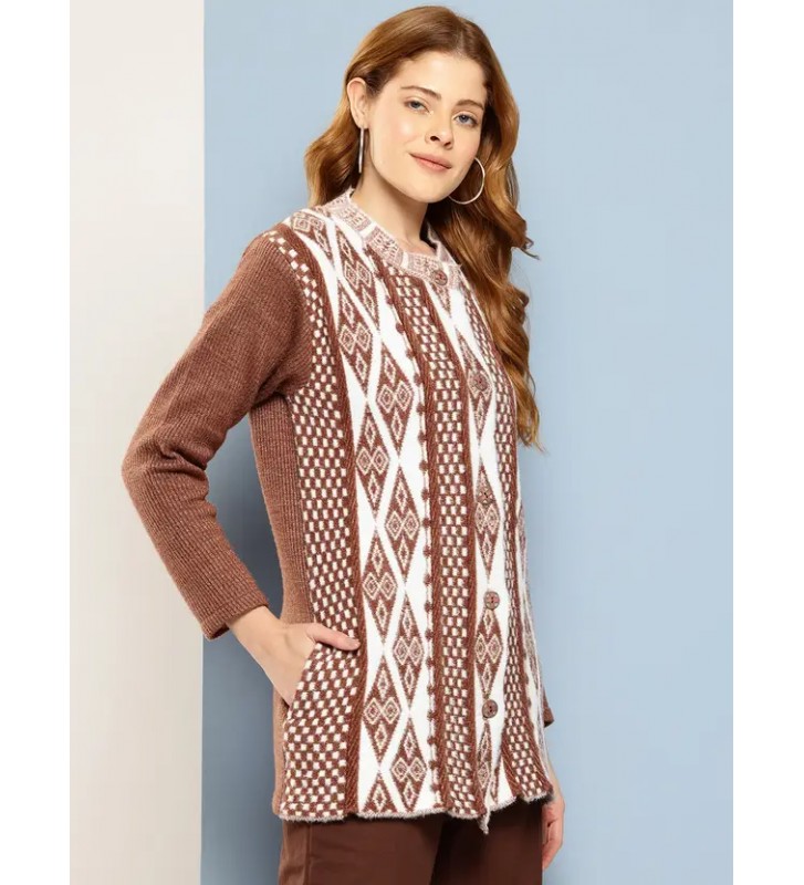 Solid Round Neck Casual Women Pure Wool Brown Cardigan