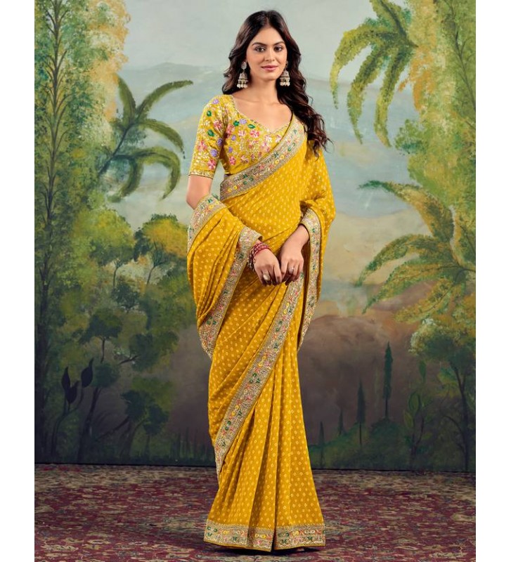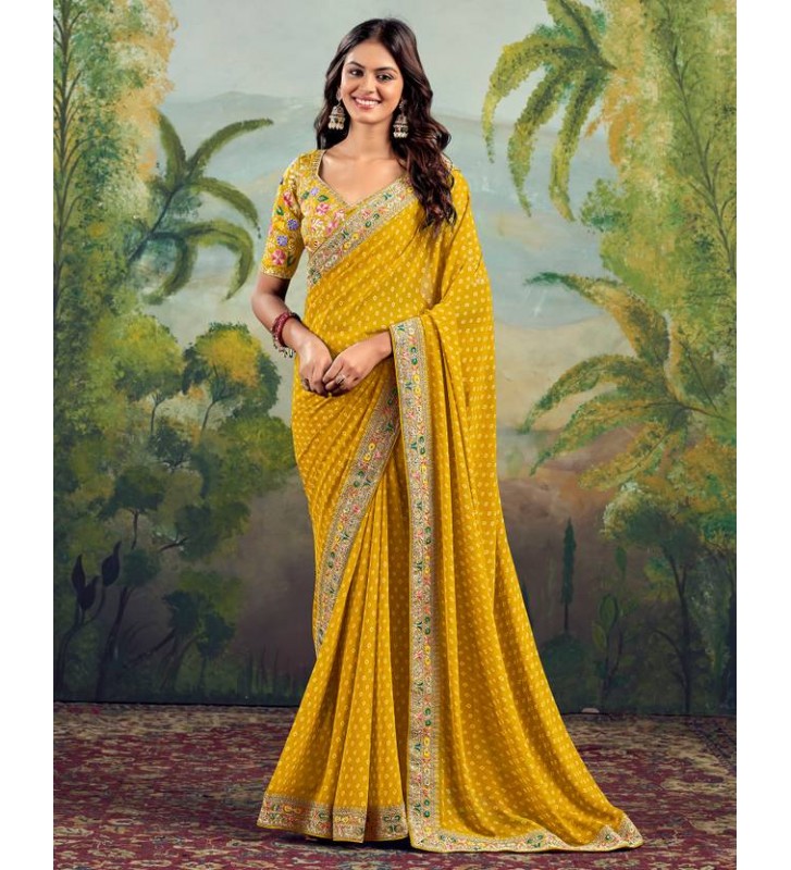 Embellished, Embroidered, Printed Bandhani Georgette, Lace Saree (Yellow)